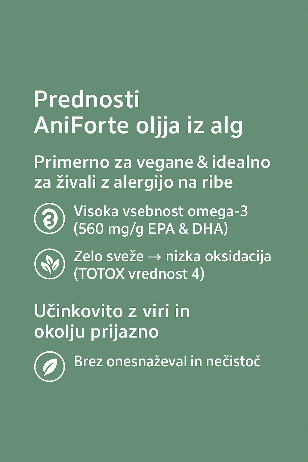 AniForte® olje iz alg je veganska alternativa ribjemu olju za pse, mačke in konje, ki imajo alergijo ali intoleranco na ribe. Vsebuje visoko koncentracijo omega‑3 maščobnih kislin EPA in DHA (560 mg/g), ki podpirajo vitalno kožo, močne kosti in sijočo dlako. Izdelek nastaja z ekološko fermentacijo alg, je okolju prijazen proces brez nepotrebnih odpadkov.